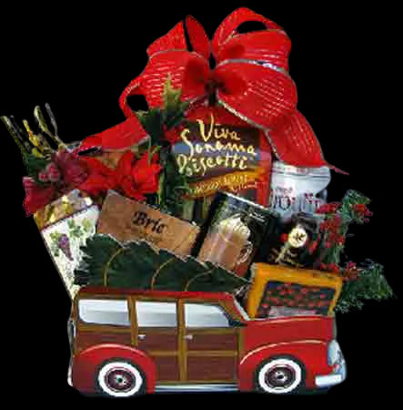 This detailed cardboard car shaped gift box is overloaded with holiday treats including cheeses, sausage, and crackers, gourmet cookies and candies, hot chocolate and so much more.